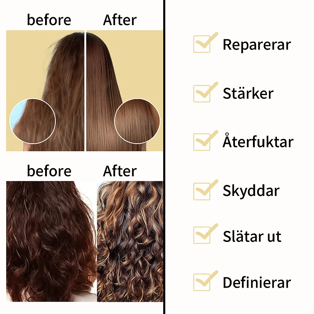 • Reparerar skadat hår – slätar ut och återfuktar torra och slitna hårstrån.